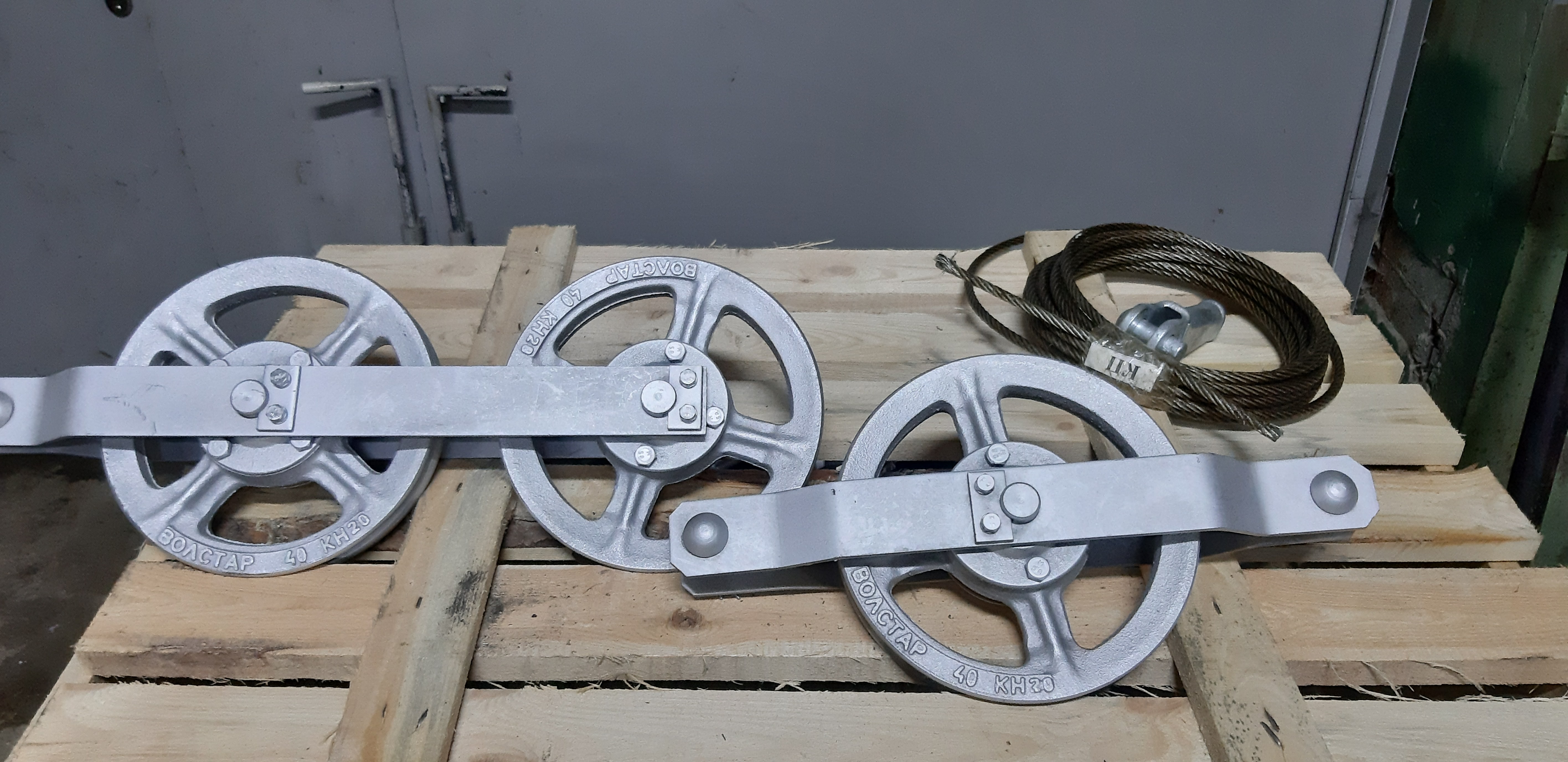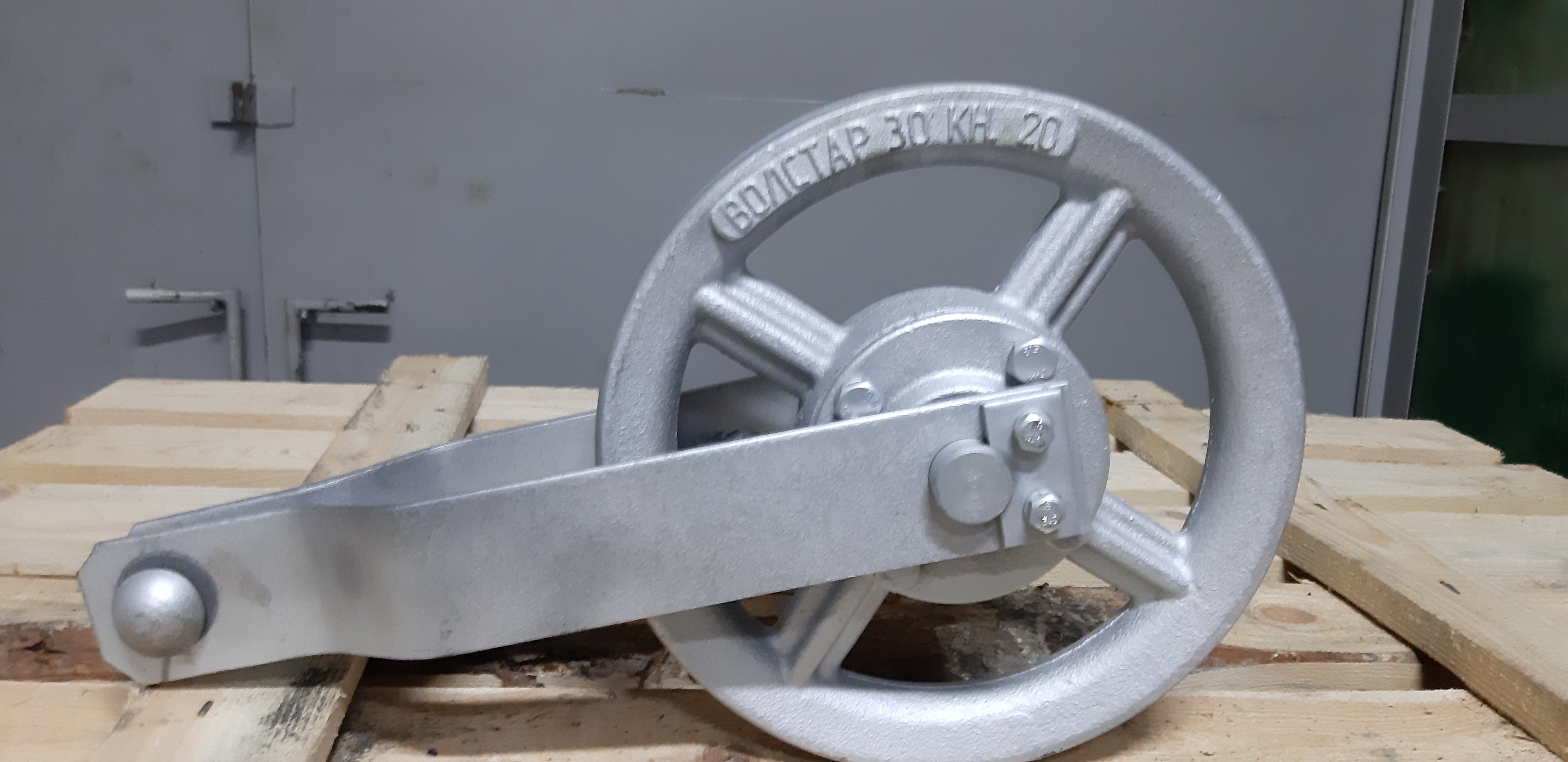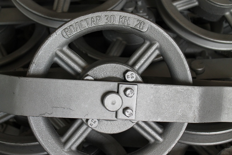 Ролики устройств, изготовлены из серого чугуна СЧ-25, маркированы литейным способом включающим: наименование предприятия, допустимую нагрузку, кН; и год выпуска.